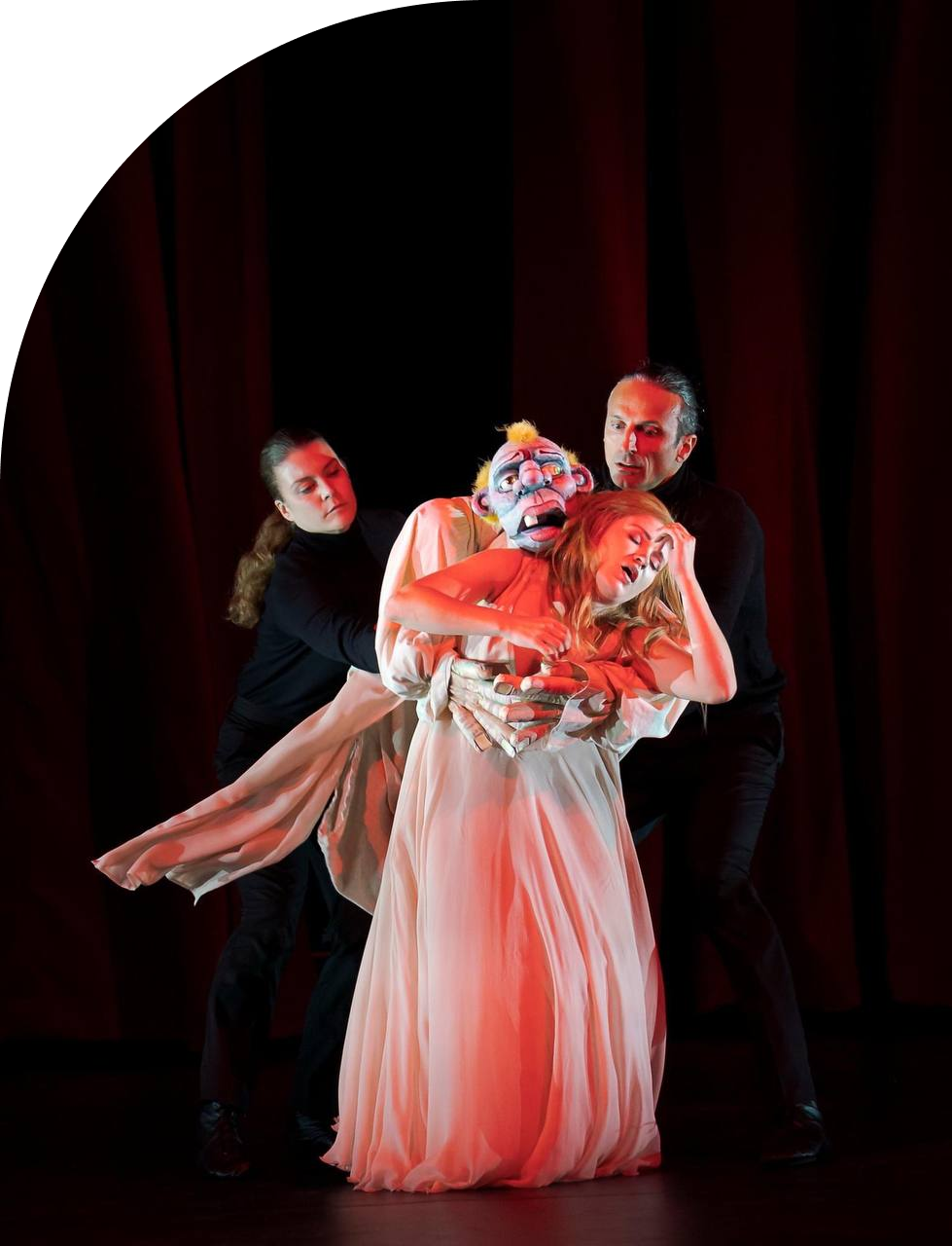 In truth, it is probably she who pulls the strings in the background, and not, as usual, her bridegroom, who is skillfully manipulated by her, as in a scene where she actually pulls him with strings tied to his arms, like one Puppet controls.